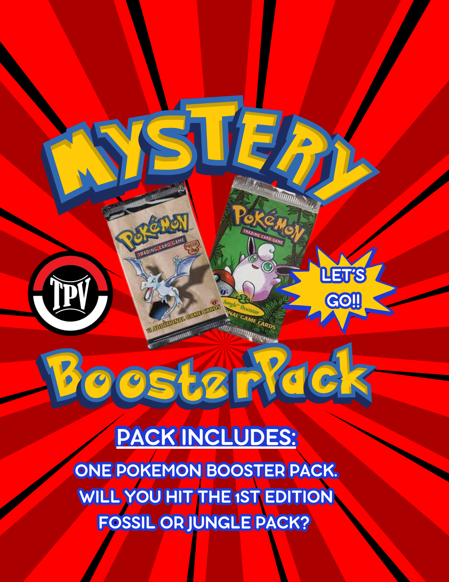 Take a chance on a thrilling mystery with this $10 TPV Booster Pack! Unwrap the unknown and find out if you're the lucky one to hit a 1st edition Fossil or Jungle Pack! Who knows what surprises await beneath the foil wrapper!?